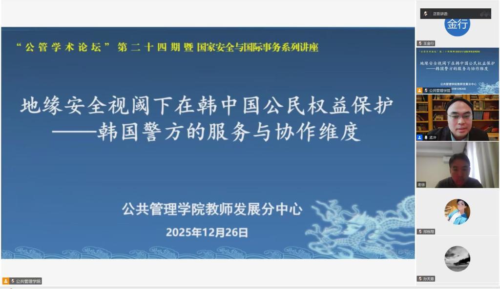 为拓宽师生国际视野,增强对跨国安全治理实践的认知,12月26日,公共管理学院在线上举办第二十四期“公管学术论坛”暨国家安全与国际事务系列讲座。本次讲座邀请原韩国驻武汉领事馆领事徐正浩作题为《地缘安全视阈下在韩中国公民权益保护——韩国警方的服务与协作维度》的报告,业务副院长孟冲主持,学院师生参加讲座。