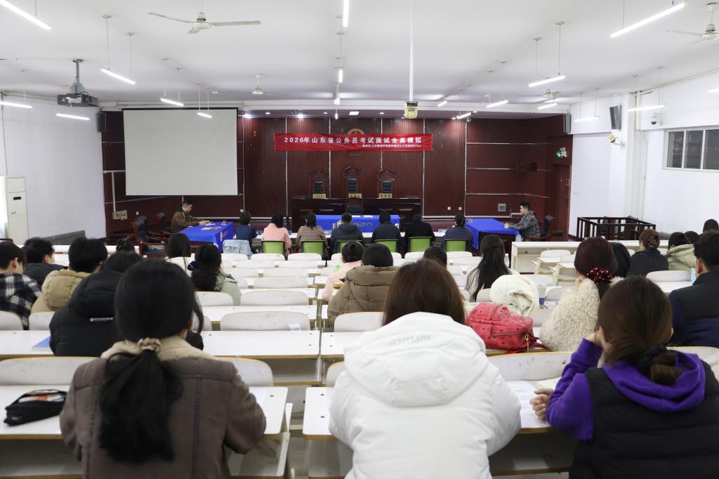 3月12日,2026年山东省公务员考试面试全真模拟观摩活动在知行楼模拟法庭举行,活动邀请公务员面试辅导专家担任考官,已进入省考面试环节的学子参加模拟面试环节。