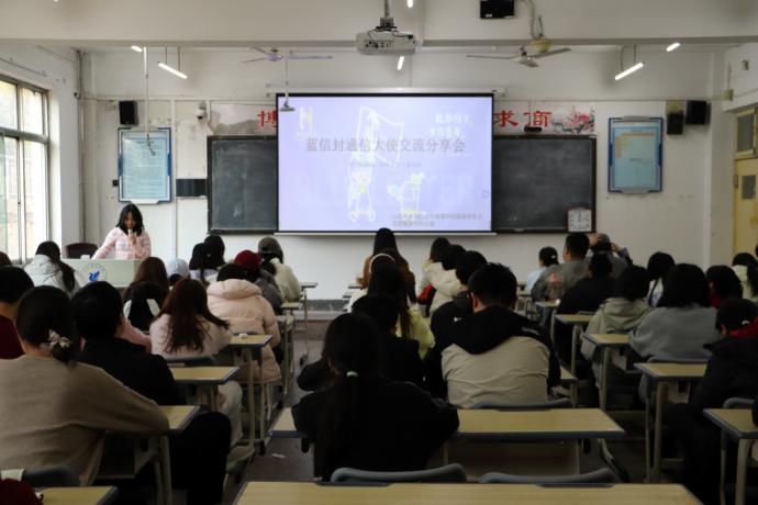 分享会上,往届蓝信封通信大使详细介绍了蓝信封项目的基本情况,并结合自身志愿经历,分享了与乡村儿童书信往来中的暖心故事、书信陪伴的心得感受和与儿童沟通的技巧,解答了参与项目的相关疑问,让在场同学们真切感受到了书信传递温暖填补乡村儿童情感空缺的强大力量。本次分享会得到同学们的热情响应,36名同学积极申请成为蓝信封通信大使,充分展现了学院学子参与志愿服务的热情,进一步激发了同学们的同理心与社会责任感,以实际行动传递善意与温暖。
